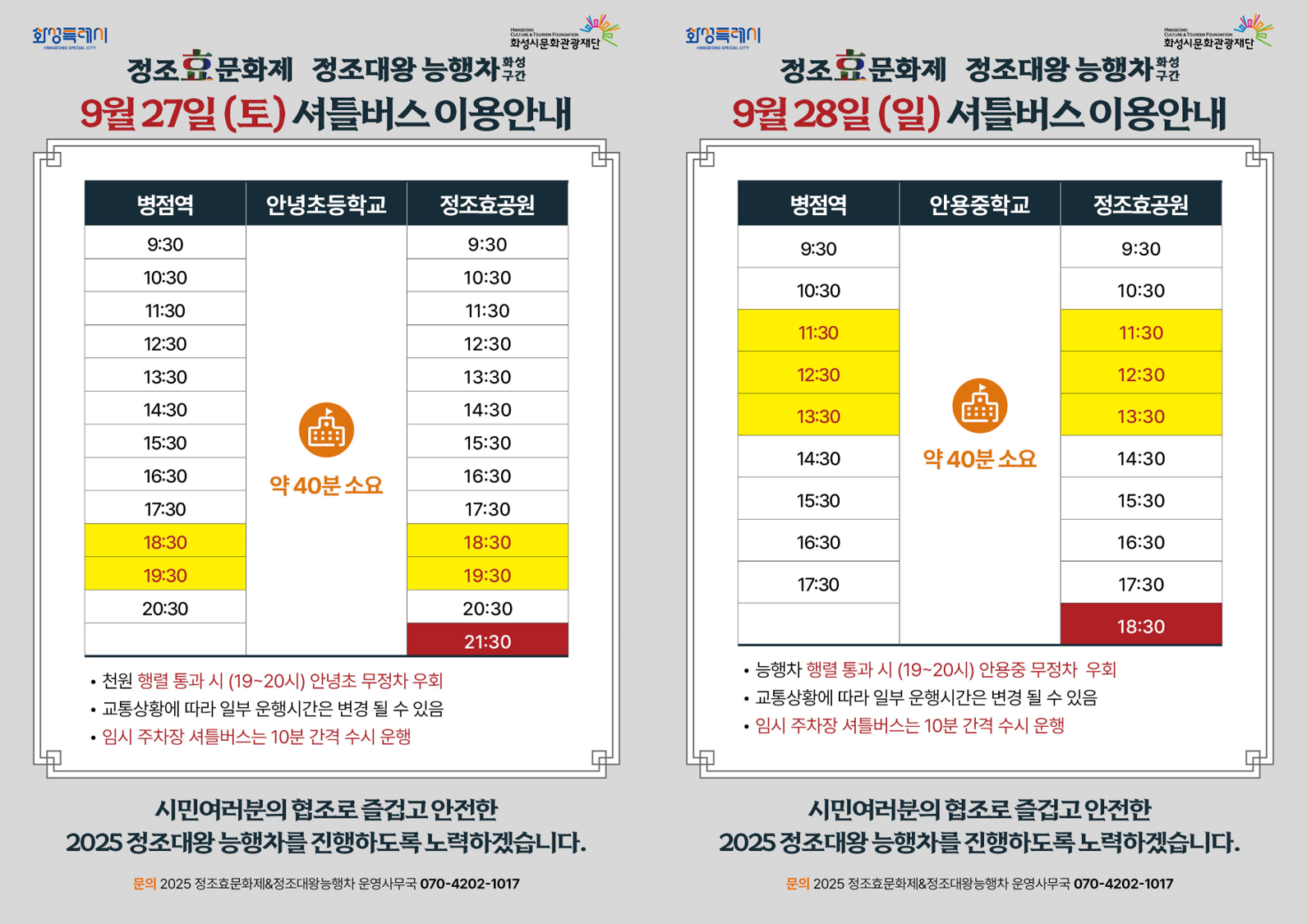 「2025 정조효문화제 & 정조대왕 능행차 화성구간」셔틀버스 시간표 안내